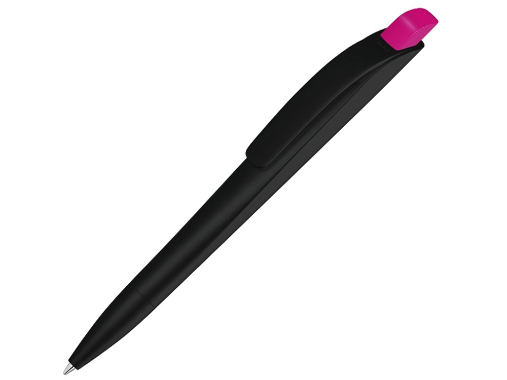 Автоматическая шариковая ручка с нажимным механизмом, матовым тонированным белым корпусом и цветным наконечником, широким изогнутым клипом.