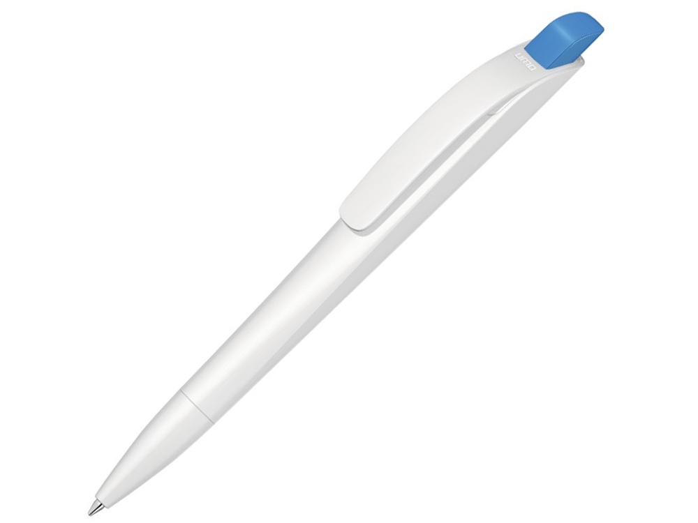 Автоматическая шариковая ручка с нажимным механизмом, матовым тонированным белым корпусом и цветным наконечником, широким изогнутым клипом.