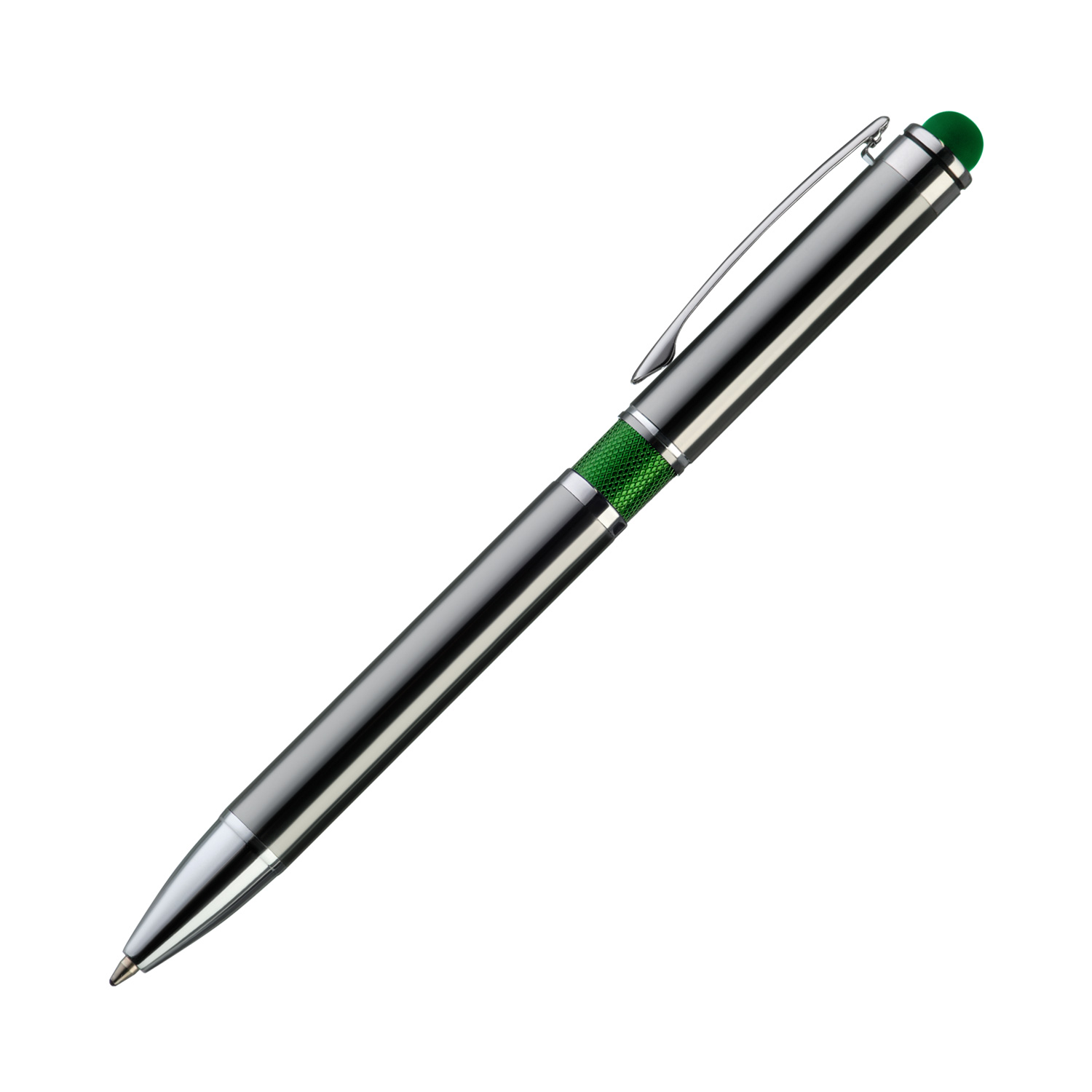 Классическая ручка цвета металлик с цветными деталями. Оснащена стилусом для работы с сенсорными экранами.
