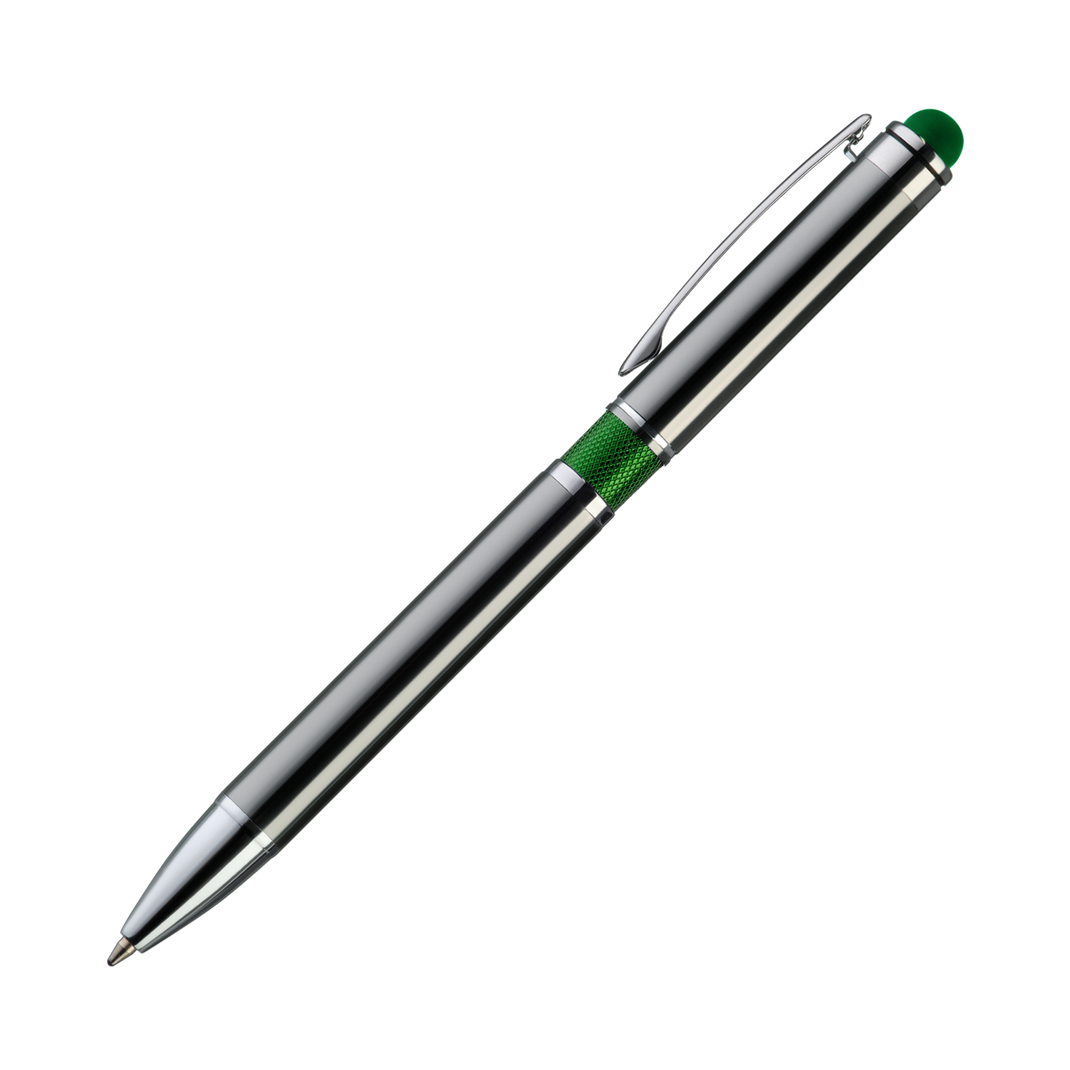 Классическая ручка цвета металлик с цветными деталями. Оснащена стилусом для работы с сенсорными экранами.