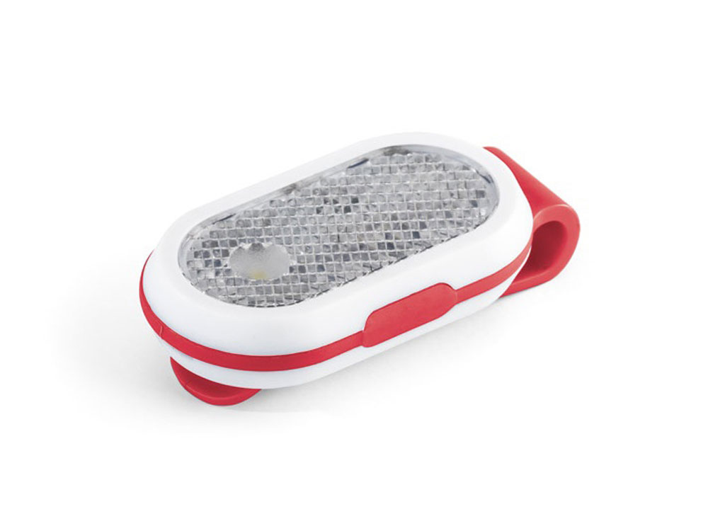 Светоотражатель из ABS с 2 лампочками LED, 2 режимами света и задним зажимом. 2 батарейки CR1220 включены в комплект. 30 x 61 x 16 мм