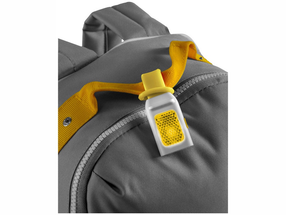 Отражатель для использования на улице с 3 яркими белыми светодиодами и функцией равномерного мигания. Эластичный силиконовый ремень для удобного присоединения к велосипеду или сумке.