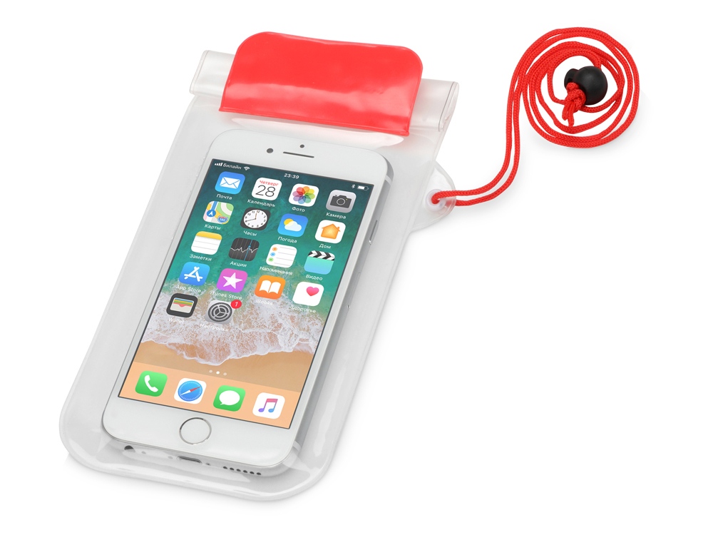 Влагостойкий чехол Mambo. Чехол с матовой прозрачной задней панелью, прозрачным окном для тач скринов спереди, замком - застежкой и цветным клапаном на застежке-липучке. Шнурок на шею с кулиской высотой 50 см. ПВХ.