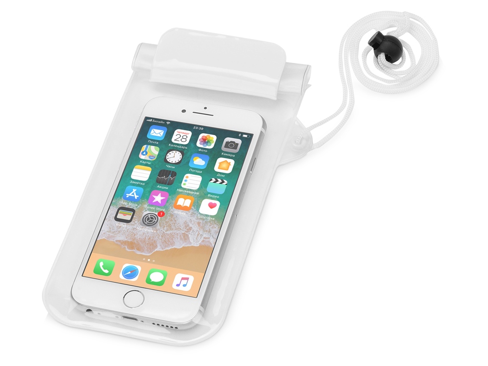 Влагостойкий чехол Mambo. Чехол с матовой прозрачной задней панелью, прозрачным окном для тач скринов спереди, замком - застежкой и цветным клапаном на застежке-липучке. Шнурок на шею с кулиской высотой 50 см. ПВХ.