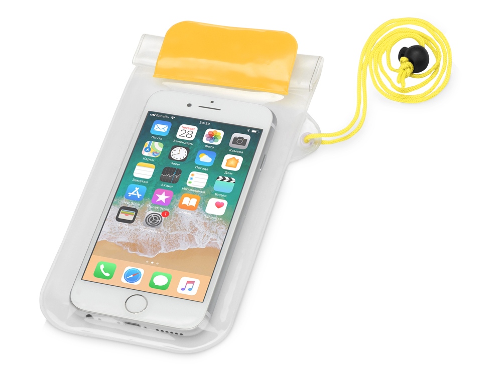 Влагостойкий чехол Mambo. Чехол с матовой прозрачной задней панелью, прозрачным окном для тач скринов спереди, замком - застежкой и цветным клапаном на застежке-липучке. Шнурок на шею с кулиской высотой 50 см. ПВХ.