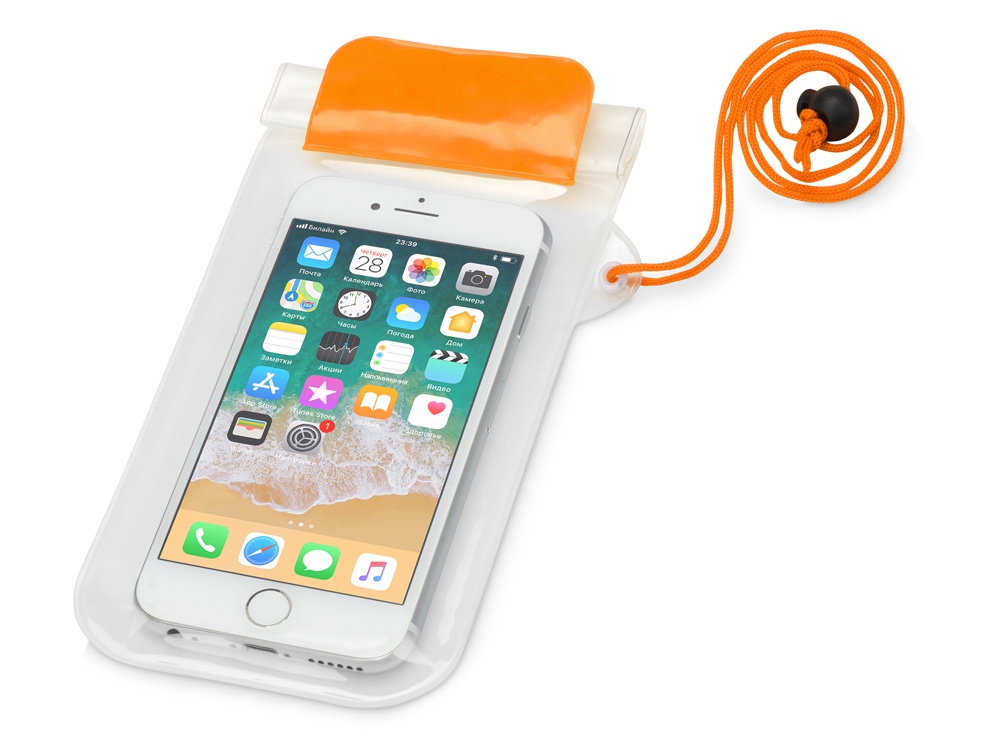 Влагостойкий чехол Mambo. Чехол с матовой прозрачной задней панелью, прозрачным окном для тач скринов спереди, замком - застежкой и цветным клапаном на застежке-липучке. Шнурок на шею с кулиской высотой 50 см. ПВХ.