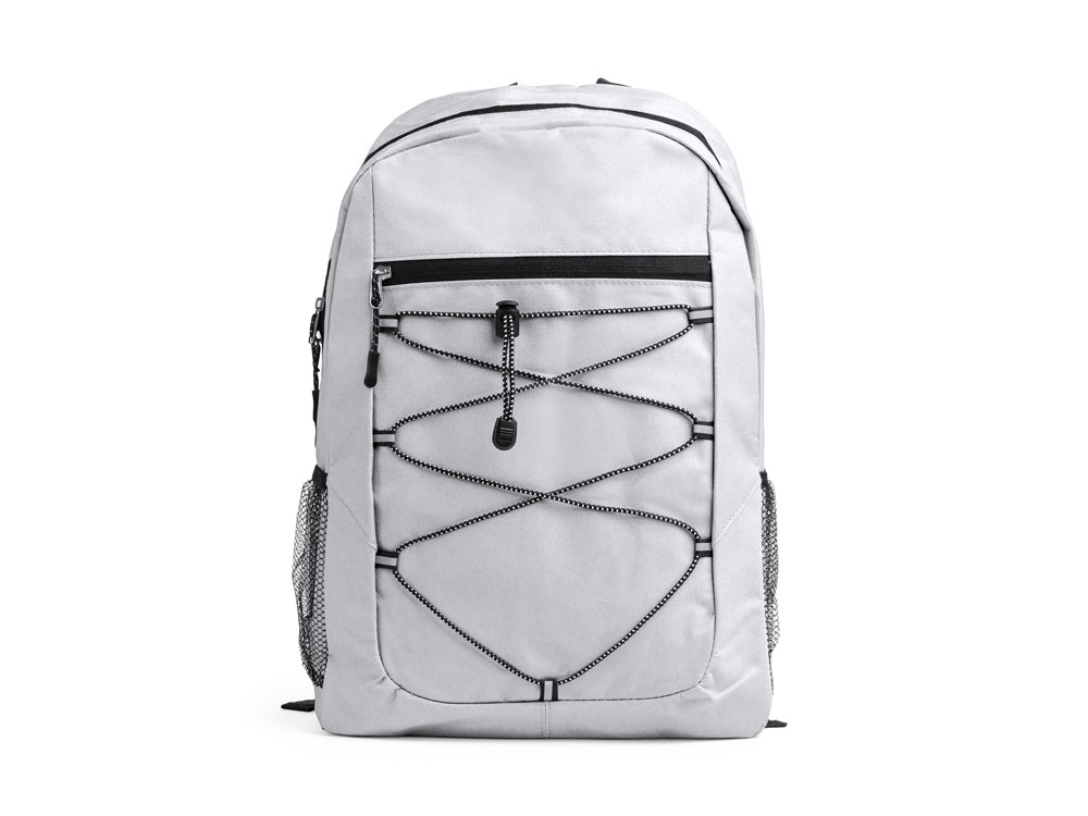 Спортивный рюкзак из полиэстера 600D. Основное отделение и передний карман на молнии. Переднее отделение на эластичном шнуре с сетчатыми боковыми карманами. Мягкая спинка и лямки.