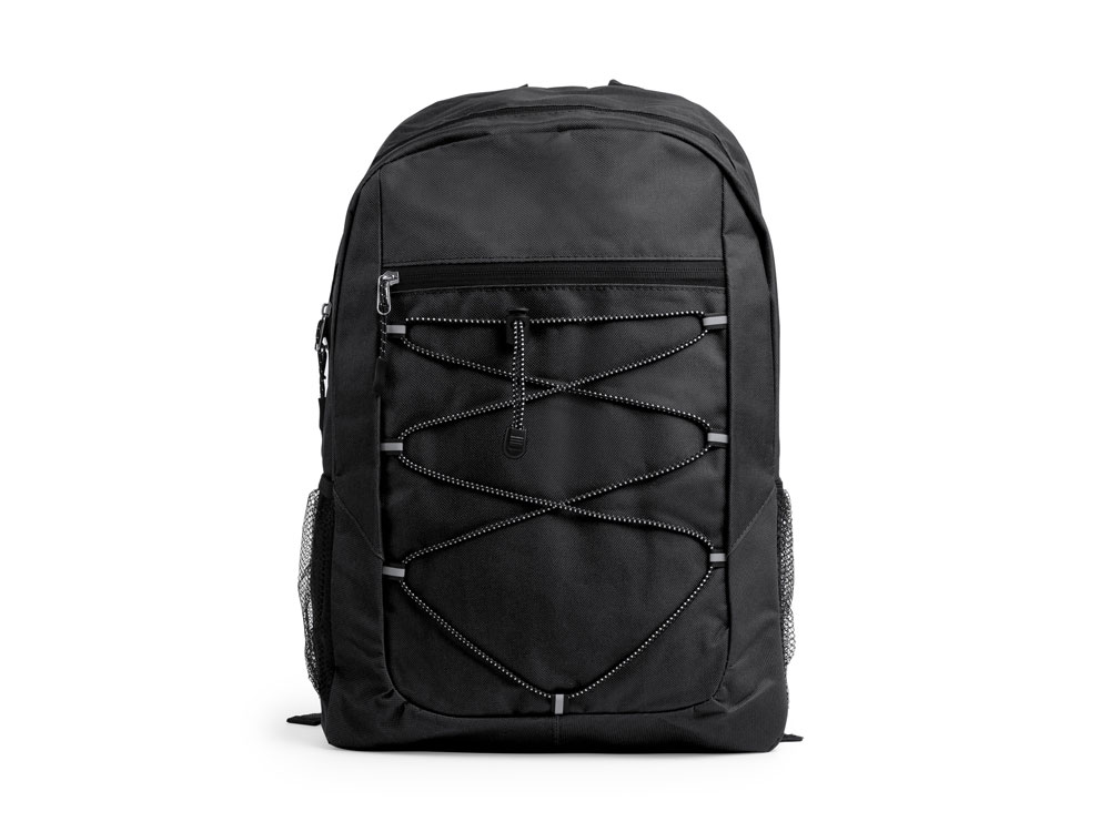 Спортивный рюкзак из полиэстера 600D. Основное отделение и передний карман на молнии. Переднее отделение на эластичном шнуре с сетчатыми боковыми карманами. Мягкая спинка и лямки.