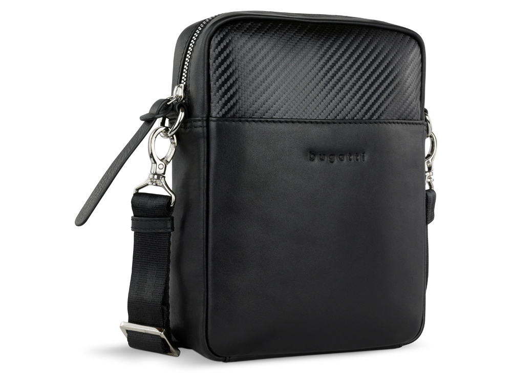 Сумка наплечная мужская BUGATTI КОМЕТА | COMET, чёрная, воловья кожа/полиэстер, 17х4,7х21 см