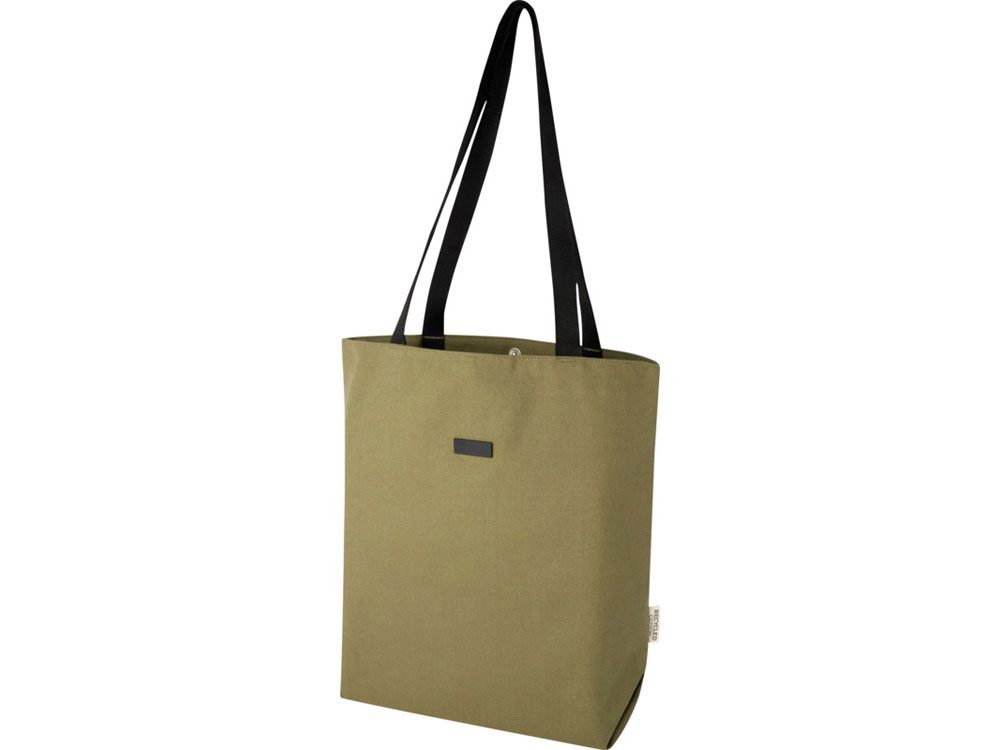 Эко-сумка изготовлена из переработанного холста, сертифицированного по стандарту GRS, и имеет подкладку из переработанного ПЭТ-пластика, сертифицированного по стандарту GRS. Универсальная эко-сумка имеет мягкое отделение для ноутбука с диагональю 15 дюймов и два карманных рукава внутри для телефона, кошелька или аксессуаров, а также удобную застежку на кнопке для открытия и удобные плетеные ручки из хлопка. Декоративная металлическая пластина может придать логотипу сияние благодаря утонченному матовому покрытию.