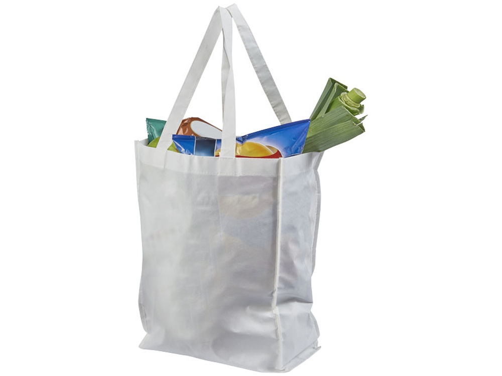 Ламинированная сумка для покупок среднего размера. Открытое основное отделение. Ламинированный материал водонепроницаемый и легко моется. Высота ручек 25 см. Ламинированный нетканый полипропилен 80г. Трафаретная печать (1 цвет (цветные изделия)) на данный товар осуществляется бесплатно. Оплачивается только настройка оборудования в размере 8700 рублей на весь тираж.