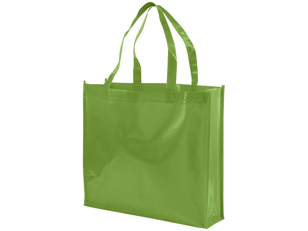Блестящая ламинированная нетканая сумка-тоут для покупок. Удобная ламинированная нетканая сумка-тоут для покупок с ниспадающей ручкой длиной 23 см. Ламинированный нетканый полипропилен.
