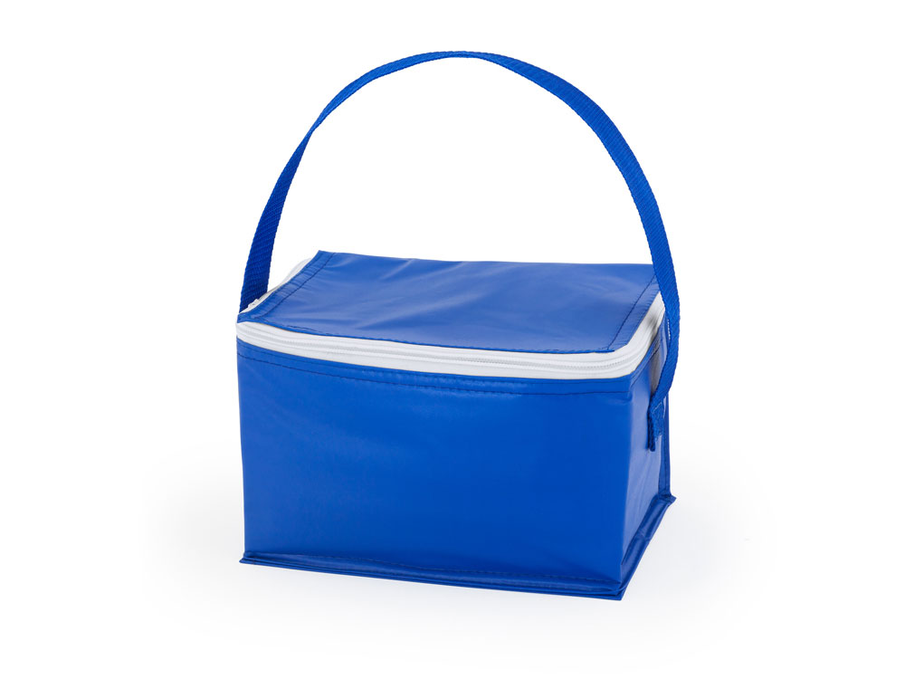 Сумка-холодильник с подкладкой из изотермического алюминия на 6 банок из ПВХ. Ручка для переноски и застежка-молния.