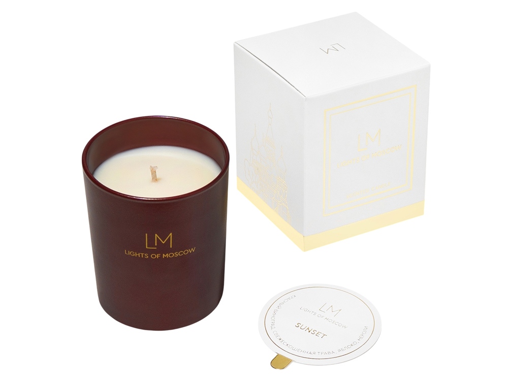 Коллекция аромасвечей Exclusive является уникальной не только из-за ароматов коллекции, но и благодаря тщательно разработанному дизайну упаковки, которая является напоминанием о том, что бренд Lights of Moscow - это ручное российское производство в самом центре Москвы. Белая коробка оформлена ярким золотым фольгированием, на левой стороне которой изображен Храм Василия Блаженного - одна из главных достопримечательностей на Красной площади в Москве.