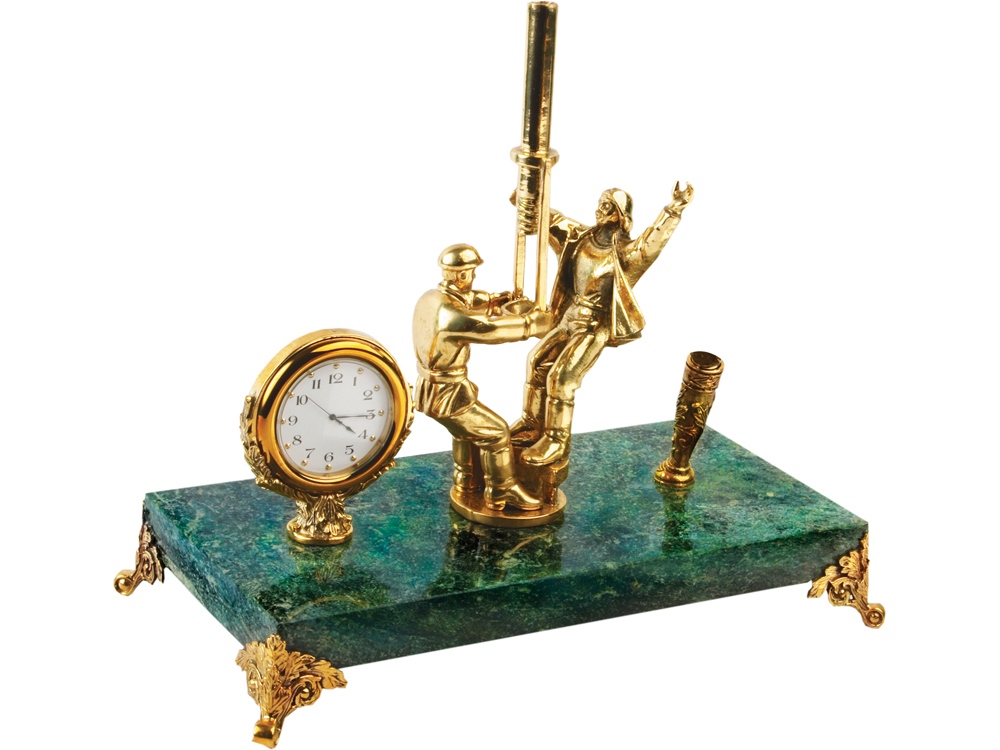 Отличный презент для руководителей и деловых партнеров в нефтедобывающей сфере. Настольный прибор, выполненный из натурального змеевика и бронзы, украшен фигурами рабочих, добывающих нефть. На приборе предусмотрены часы и держатель для ручки. Шильд спектрум (Шильд спектрум) на данный товар осуществляется бесплатно. Оплачивается только настройка оборудования в размере 1000 рублей на весь тираж.