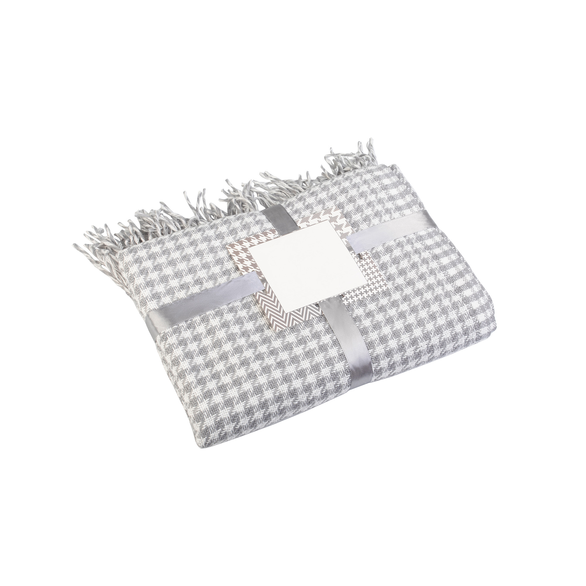 Бахрома по короткой стороне. Плед перевязан атласной лентой с картонной биркой в центре. Размер в собранном виде 32 х 38 см.