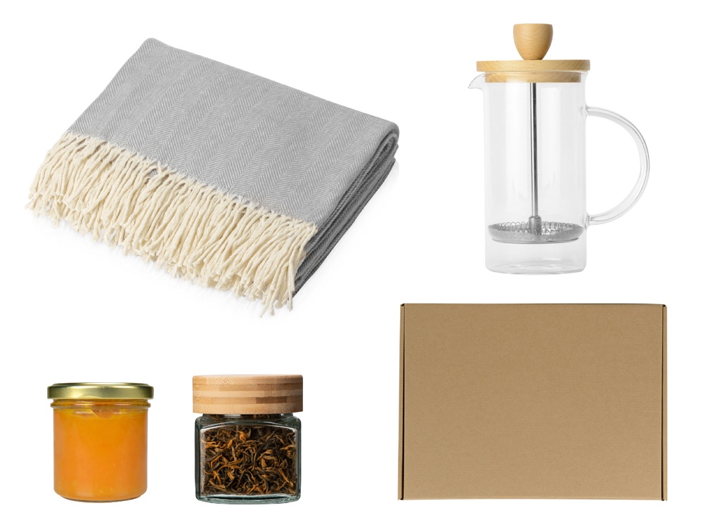 Подарочный набор с пледом, френчпрессом, чаем и вареньем, серый