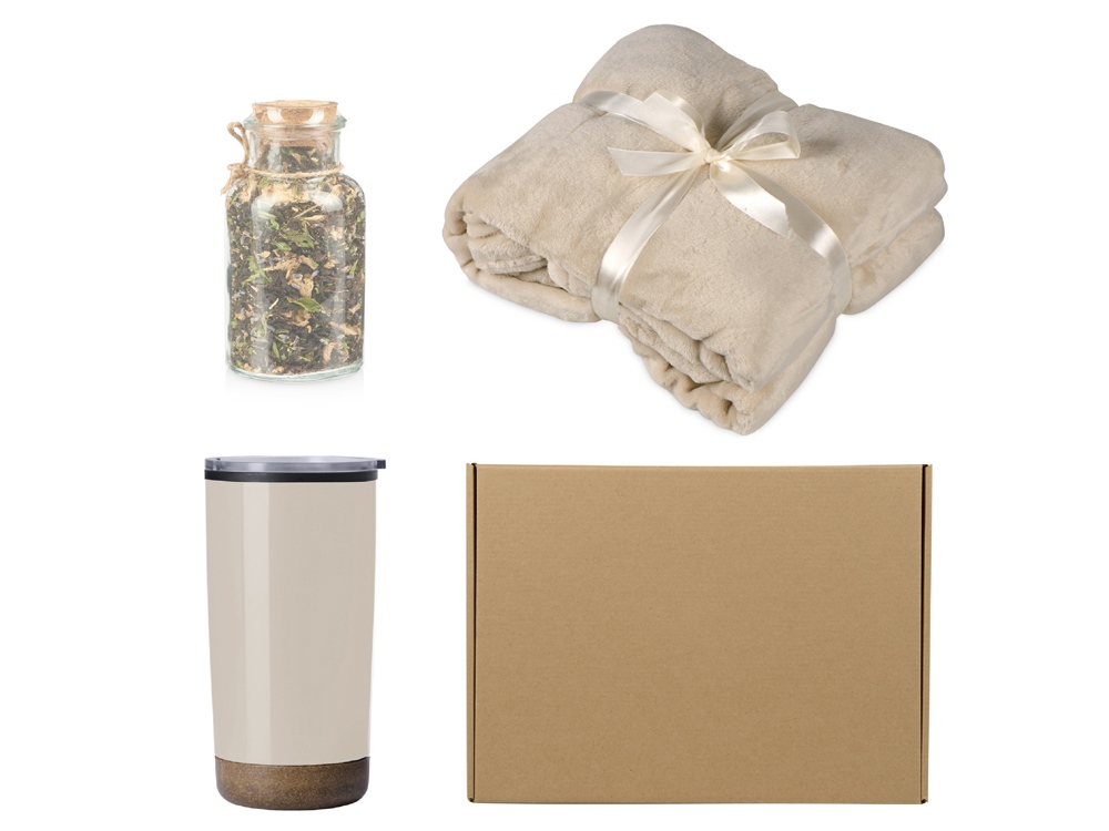 Подарочный набор с пледом, термокружкой и чаем, бежевый