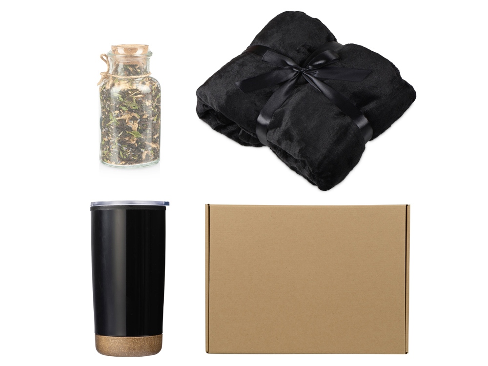 Подарочный набор с пледом, термокружкой и чаем, черный