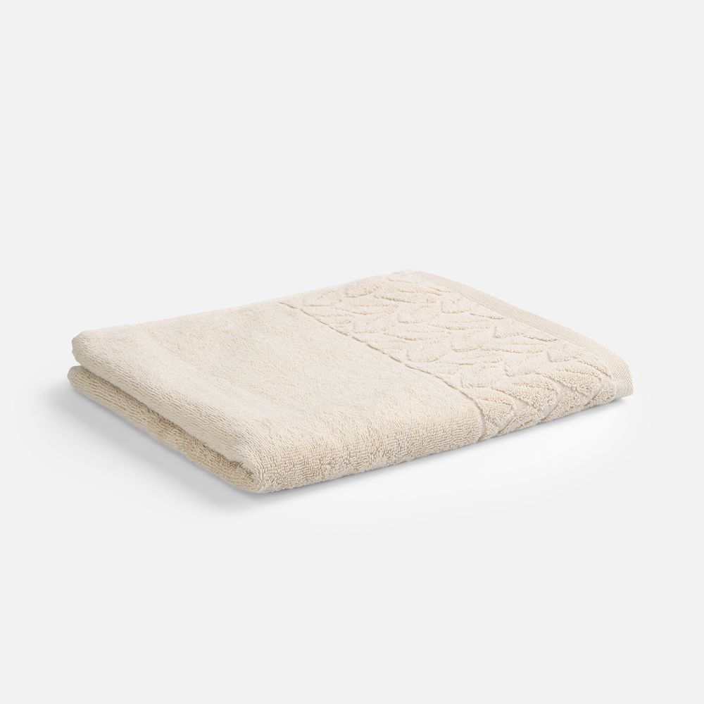 Светлые оттенки в сочетании с широким бордюром с рельефным растительным узором делают полотенце не только функциональным, но и эстетически привлекательным и элегантным.