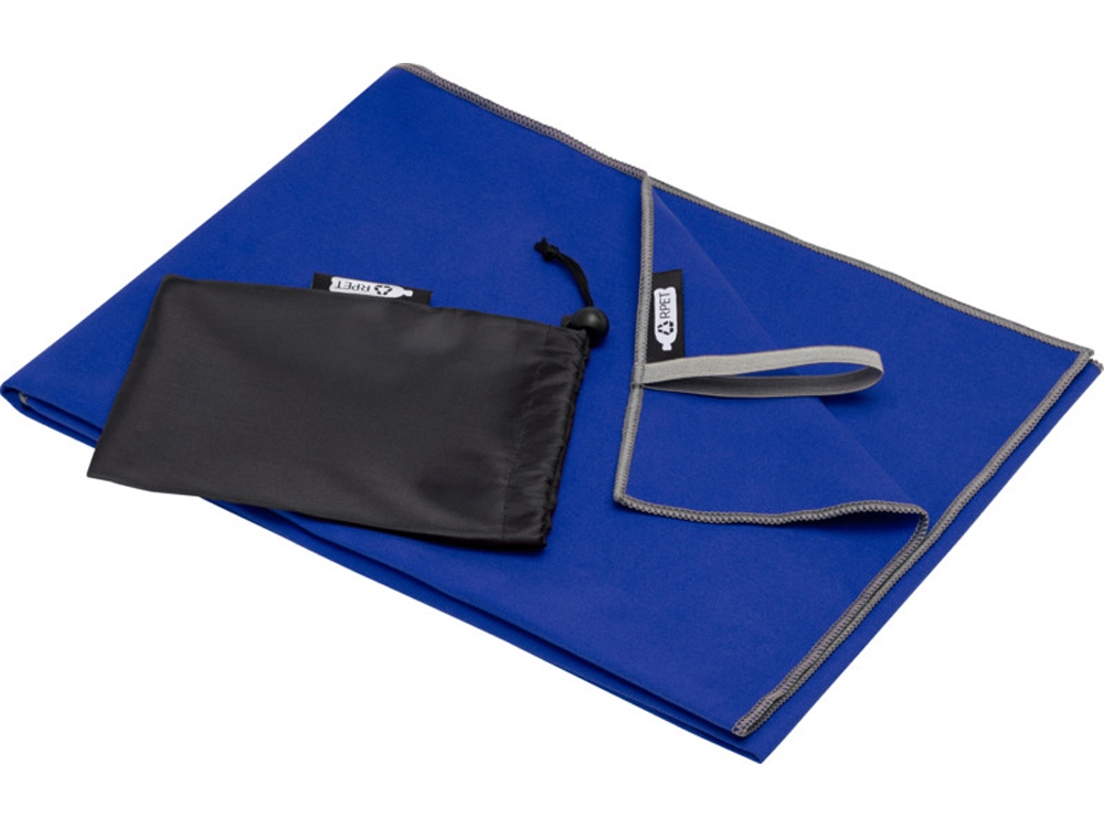 Спортивное полотенце Pieter очень хорошо впитывает влагу, легкое, быстро сохнет, а ткань прочная и очень мягкая. Когда полотенце сложено и закреплено резинкой, оно уменьшается до небольшого размера, поэтому его удобно брать с собой в тренажерный зал, бассейн, на пешую прогулку или в поход. Полотенце размером 50 х 100 см изготовлено из 90 % переработанного полиэстера GRS и 10 % нейлона. Его можно стирать в стиральной машине при температуре 40 °C. В комплект поставки входит мешок для хранения (17 x 13 см), изготовленный из переработанного ПЭТ-пластика, обеспечивающий большую площадь для печати логотипа. 90% Переработанный Полиэстер, 10% Нейлон, 200 g/m2.