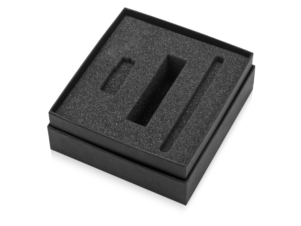 Коробка с ложементом для зарядного устройства, ручки и флешки. Коробка изготовлена из переплетного картона кашированного дизайнерской бумагой эфалин, ложемент изготовлен из поролона премиум-класса.