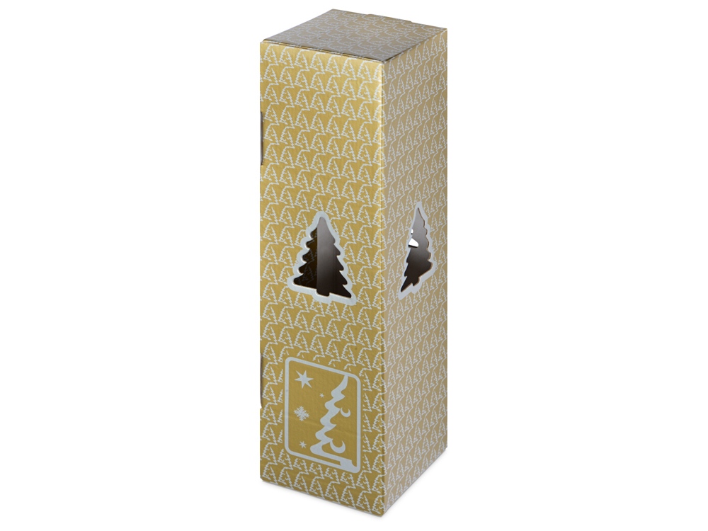 Дизайнерская упаковочная коробка для шампанского из кашированного картона с новогодним узором. Декоративная вырубка в форме елочки не только украшает коробку, но и позволяет разглядеть ее содержимое. По форме и размеру подойдет и для упаковки любого напитка в бутылке классической вытянутой формы. УФ-печать (УФ-печать цветные изделия) на данный товар осуществляется бесплатно. Оплачивается только настройка оборудования в размере 1800 рублей на весь тираж.