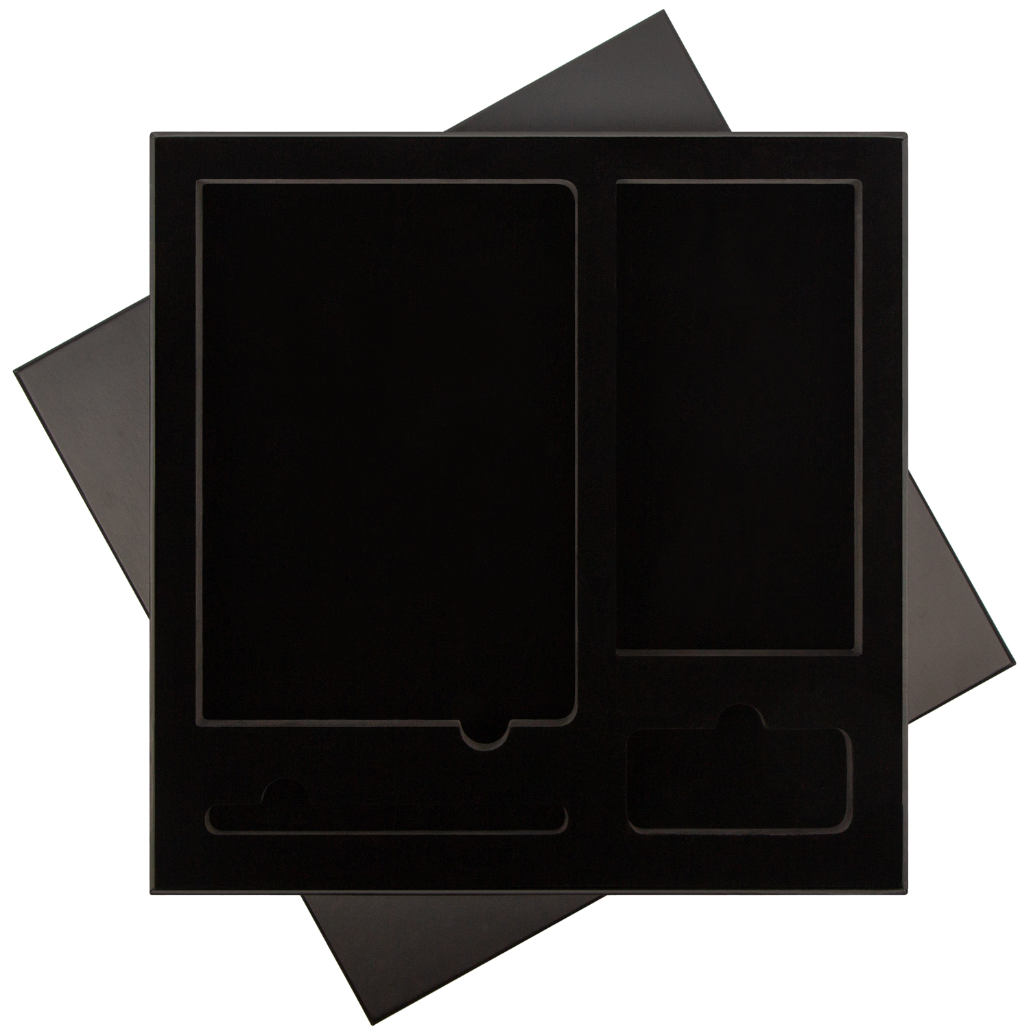 Подарочная упаковка с EVA ложементом обеспечивает расширенный выбор аксессуаров: конструкторская особенность ложемента позволяет использовать его под все виды зарядных устройств. Универсальные вырубные ячейки в точности повторяют форму аксессуаров, фиксируя их положение в коробке и обеспечивая сохранность набора. А флокированный материал ложемента, фактура которого напоминает бархат, удачно сочетается со всеми комплектующими.